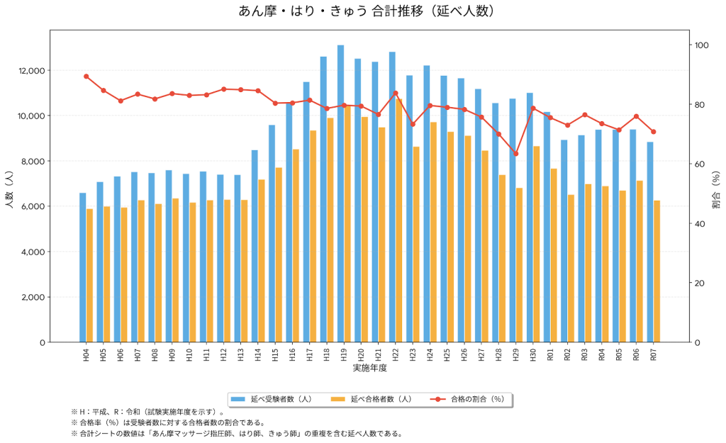 あん摩マッサージ指圧師、はり師、きゅう師の合計